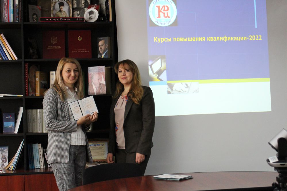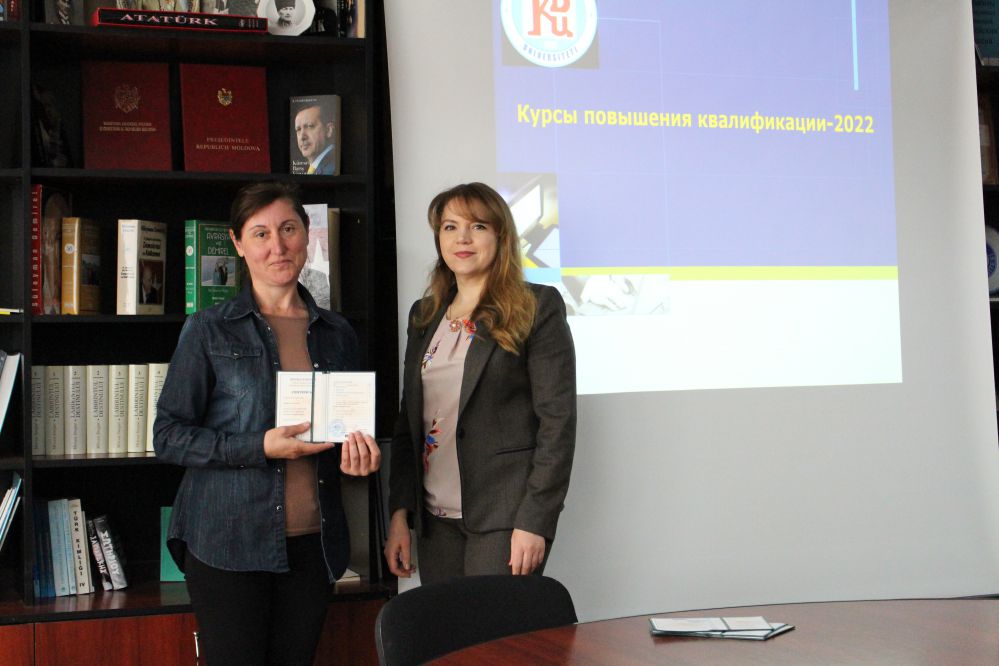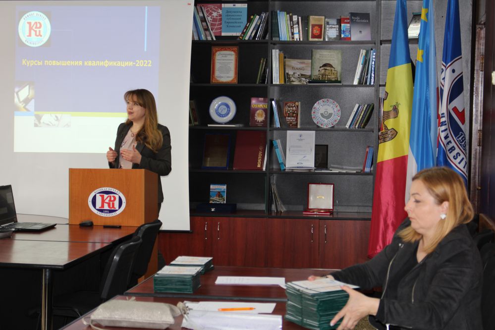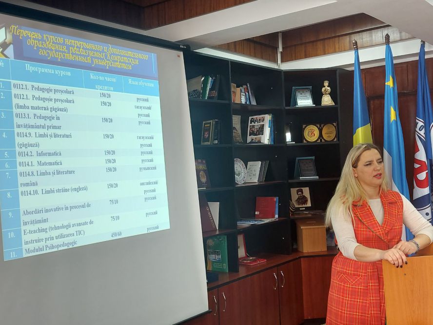 Начальник Центра непрерывного образования КГУ Дечева Каролина выступила с презентацией содержания процесса организации и проведения курсов, которые проходили в режиме он-лайн в течение 4 недель (20 кредитов) и 2 недель (10 кредитов). Была представлена статистика в отношении количества обучавшихся педагогов, а также населенных пунктов АТО Гагаузия и Молдовы, в которых работают выпускники прошедших курсов.